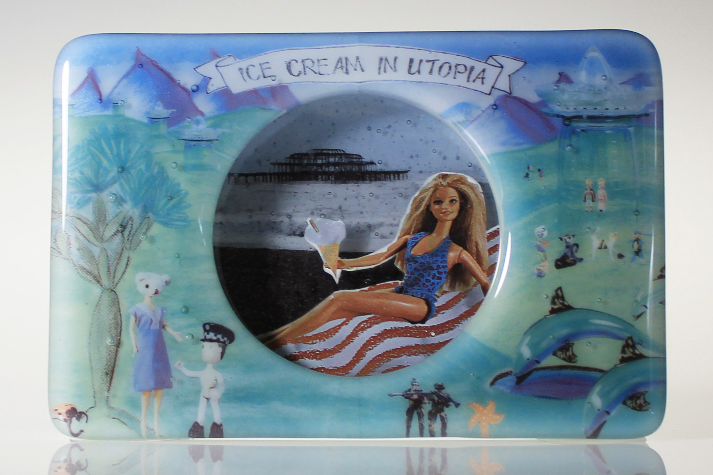 Ice Cream in Utopia was part of a few pieces exploring Utopias: how they are patched together pictures of what we want and what we have; how strange they look when taken to their bizarre conclusions. The piece was designed to be a postcard from the impossible to the present day as part of the Contemporary Glass Society’s Postcards show at the International Festival of Glass in 2015. Made for fun, the use of imagery resurfaces. The images are created from staged scenes with dolls, drawings, domestic objects and photographed, before being converted into ceramic enamel transfers that are fused onto glass in the kiln.
