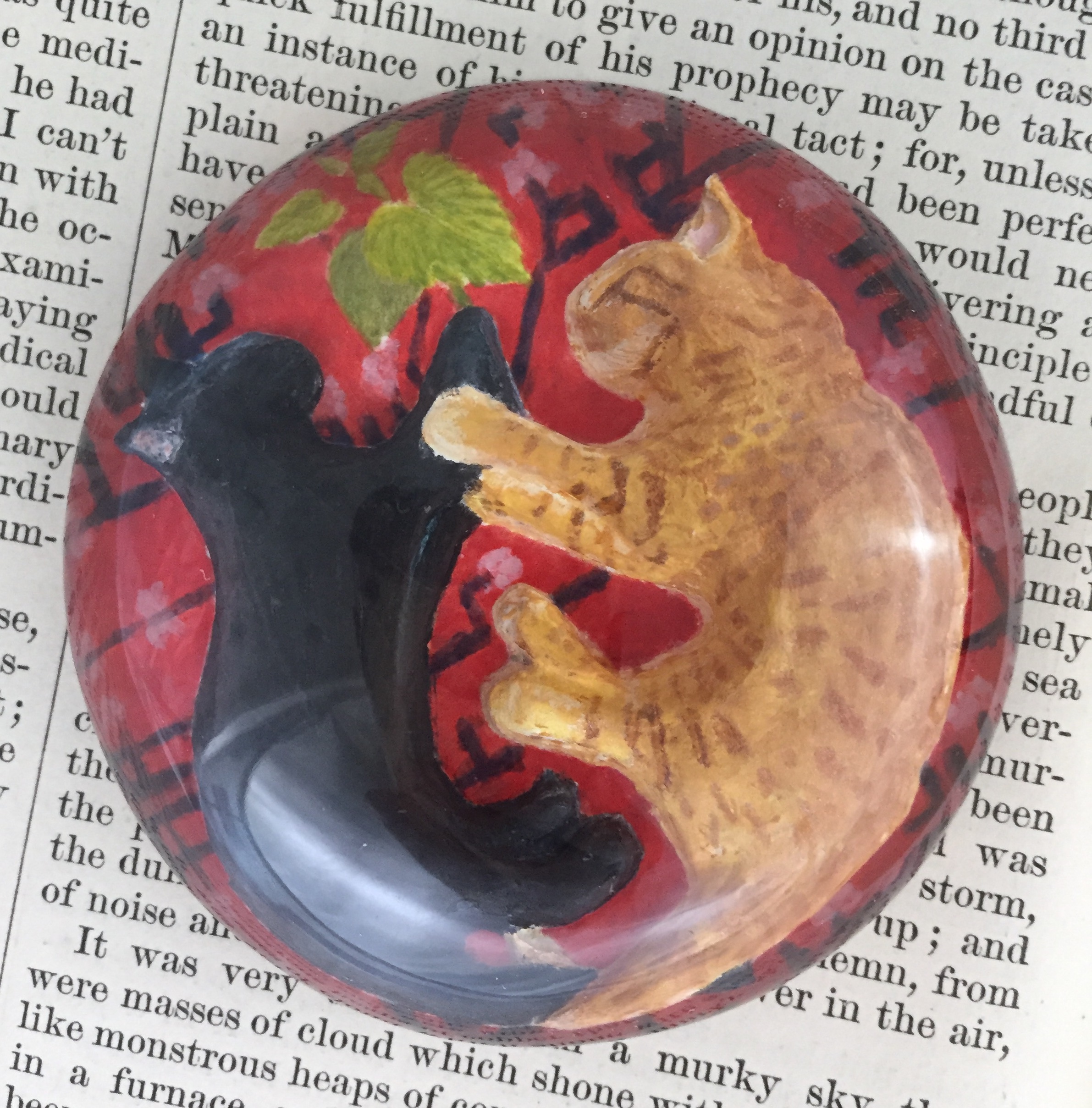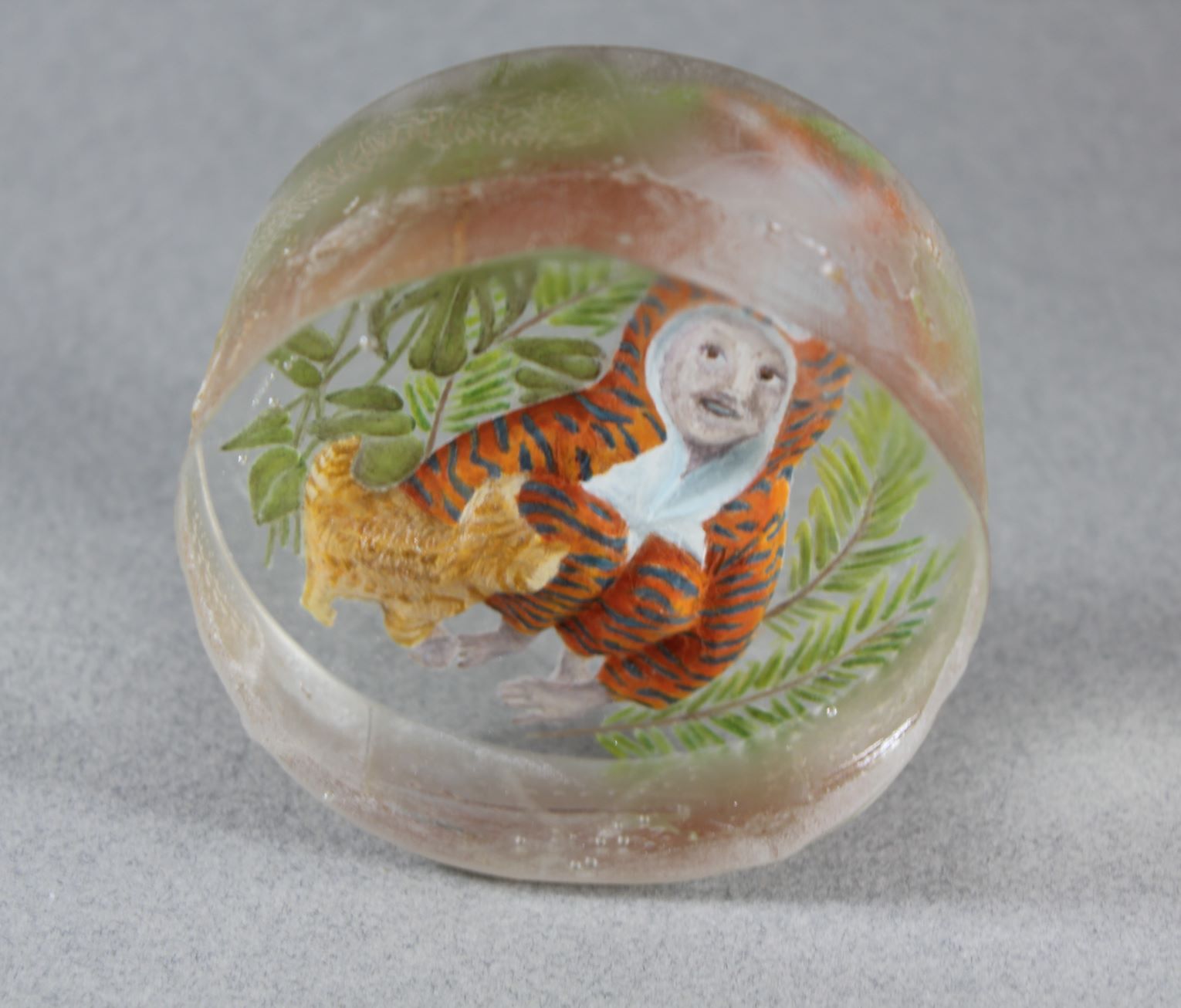 Entirely captivated by this peculiar object, I discovered that these were very much the thing two hundred years ago. They often depicted pets and animals, plants and flowers that were hand-carved and painted onto the back of highly polished rock crystal gems, creating a startling animated and three-dimensional effect. Full of symbolism and extremely weird, it felt to me that they had a visual language that I could use to say something today. What have emerged so far are gloriously coloured optical mini-worlds with a feeling of personal myth, and more than a little strangeness.