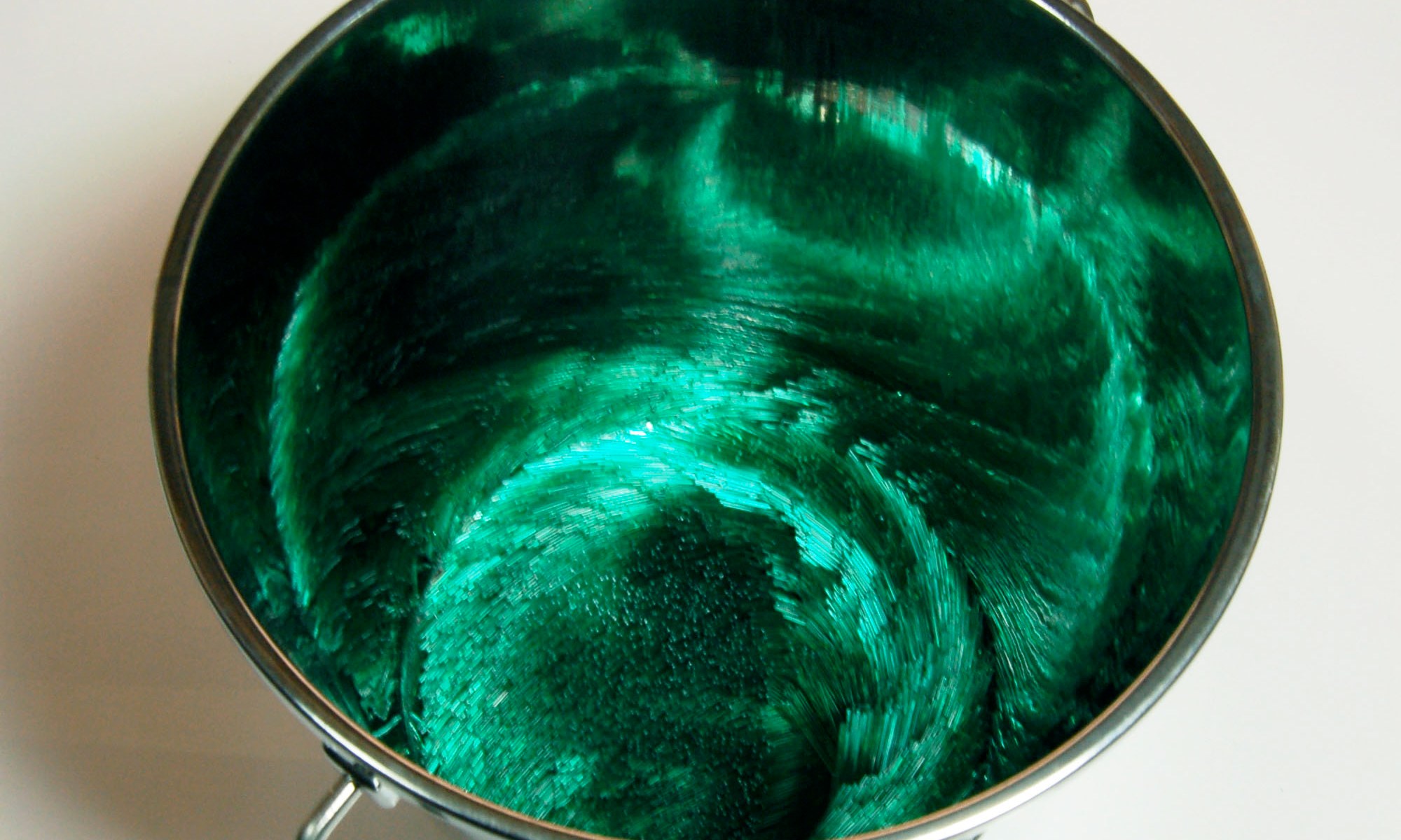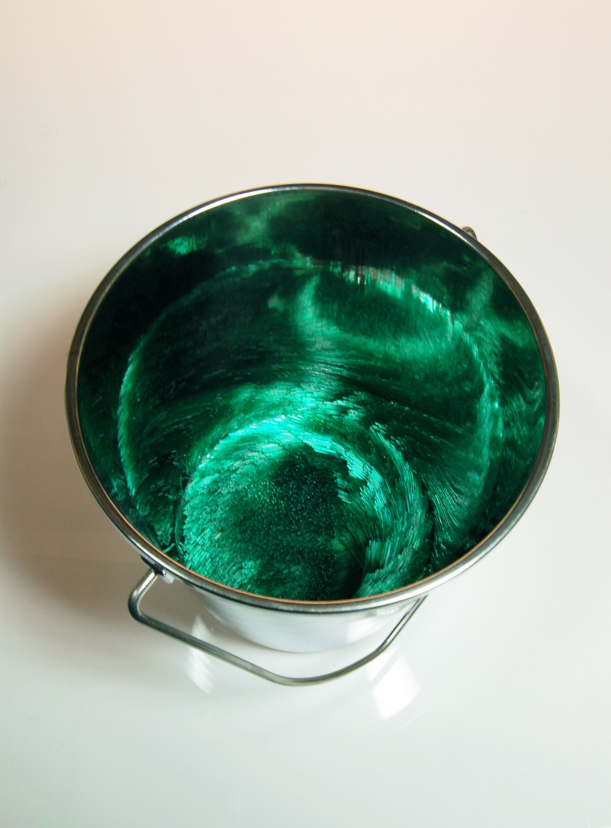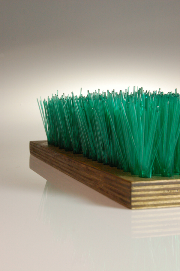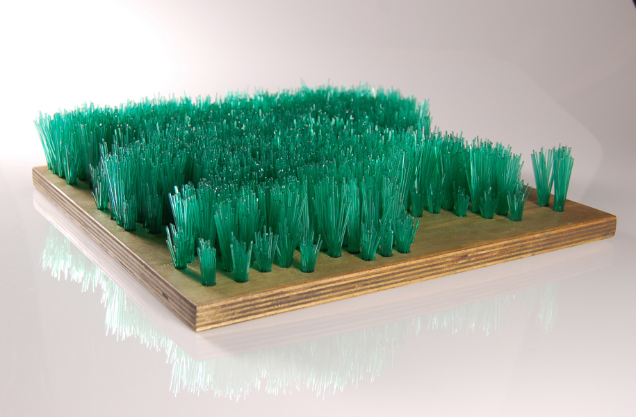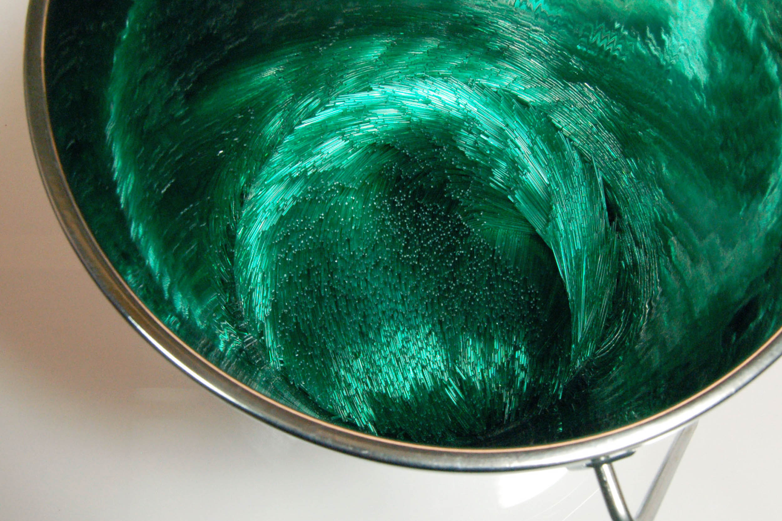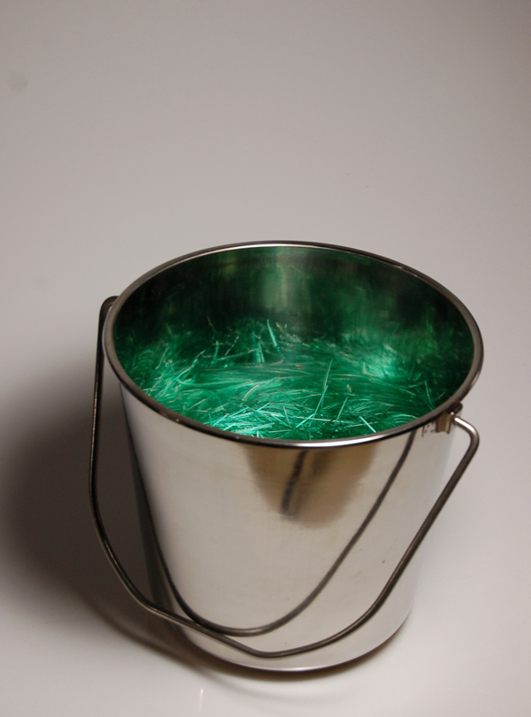 Laborious processes shape these glass and mixed media sculptures; cutting, arranging and constructing. But there are also elements that stray from the predicted path too – tufts of glass wander from the regimented rows, and reflections throw green fire back up out of the bucket in which cut elements lie in tangled confusion or sit in swirls like a crop disturbed and then flattened by the wind. As always, Scholes’ construction of glass and other materials shows her unlikely combination of a light touch with meticulous technique.